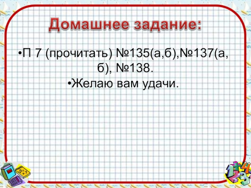 П 7 (прочитать) №135(а,б),№137(а,б), №138.Желаю вам удачи.