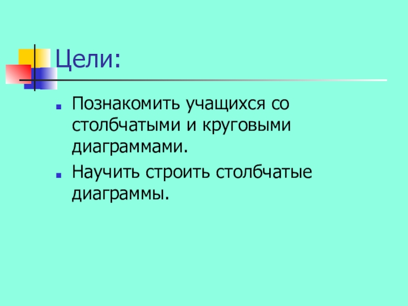 Цели:Познакомить учащихся со столбчатыми и круговыми диаграммами.Научить строить столбчатые диаграммы.