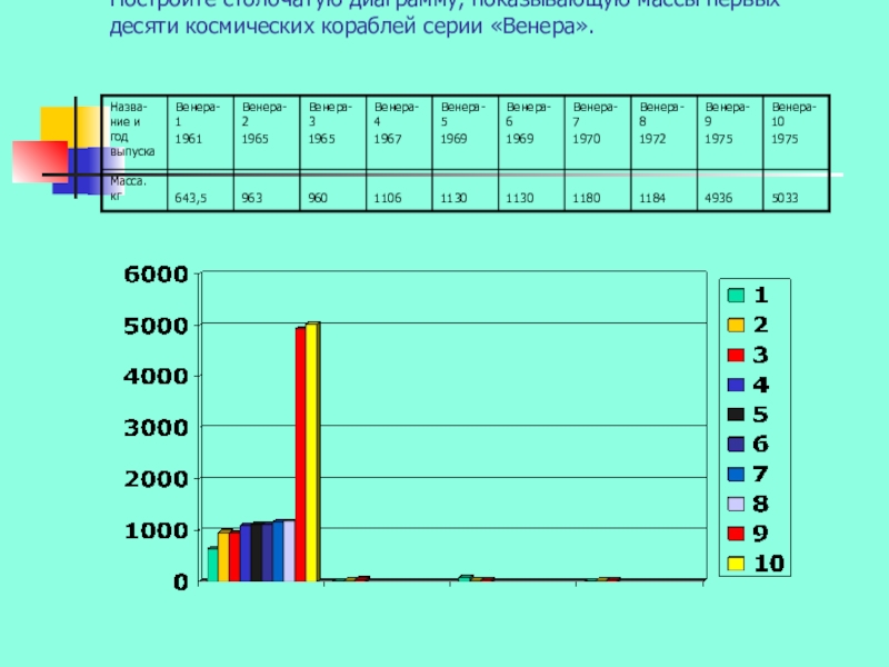 Слайд 8 Постройте столбчатую диаграмму, показывающую массы первых десяти космических кораблей серии «Венера».