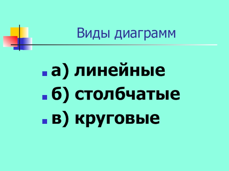 Виды диаграмм а) линейныеб) столбчатыев) круговые