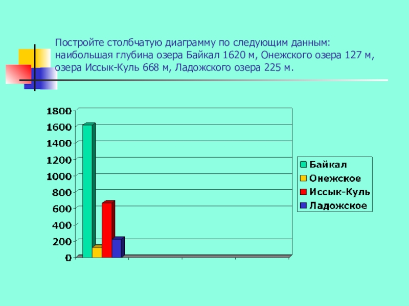 Слайд 9Постройте столбчатую диаграмму по следующим данным: наибольшая глубина озера Байкал 1620 м,