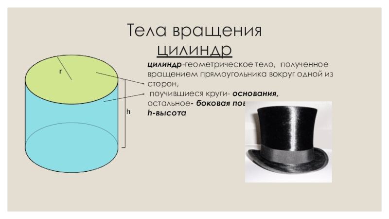 Тела вращения цилиндрцилиндр-геометрическое тело, полученное вращением прямоугольника вокруг одной из сторон, поучившиеся круги- основания, остальное- боковая поверхностьh-высота