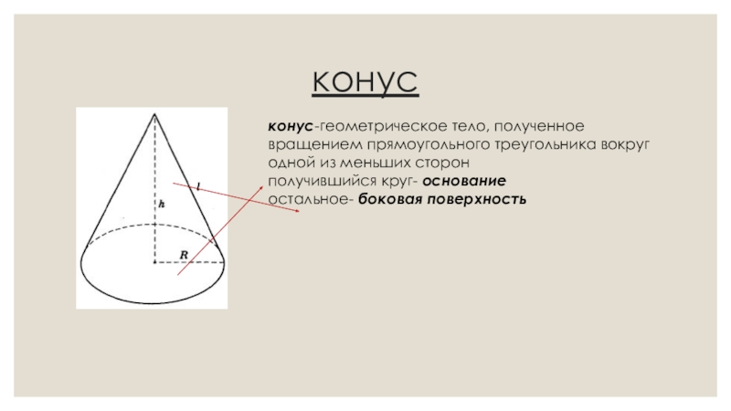конусконус-геометрическое тело, полученное вращением прямоугольного треугольника вокруг одной из меньших сторонполучившийся круг- основаниеостальное- боковая поверхность
