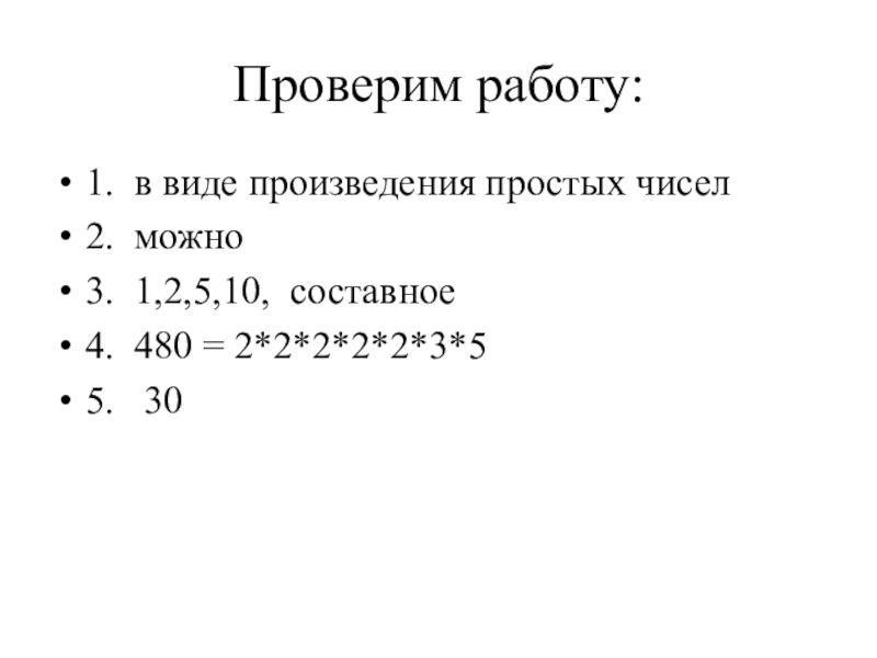 Проверим работу:1. в виде произведения простых чисел2. можно3. 1,2,5,10, составное4. 480 = 2*2*2*2*2*3*55.  30