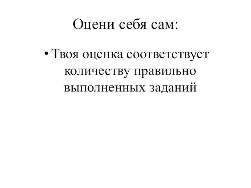 Оцени себя сам:Твоя оценка соответствует количеству правильно выполненных заданий