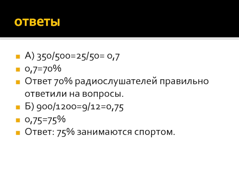 ответыА) 350/500=25/50= 0,7 0,7=70% Ответ 70% радиослушателей правильно ответили на вопросы.Б) 900/1200=9/12=0,750,75=75%Ответ: 75% занимаются спортом.