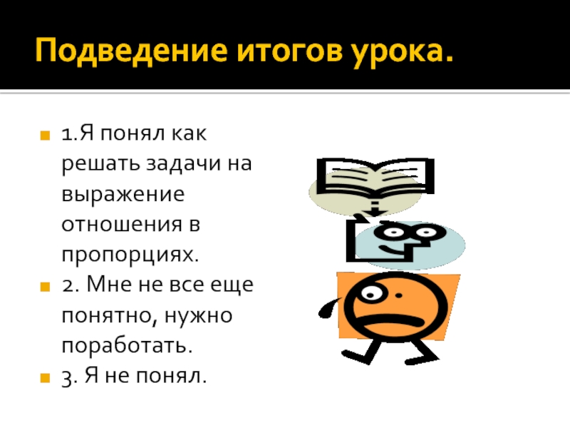 Подведение итогов урока.1.Я понял как решать задачи на выражение отношения в пропорциях.2. Мне не все еще понятно,