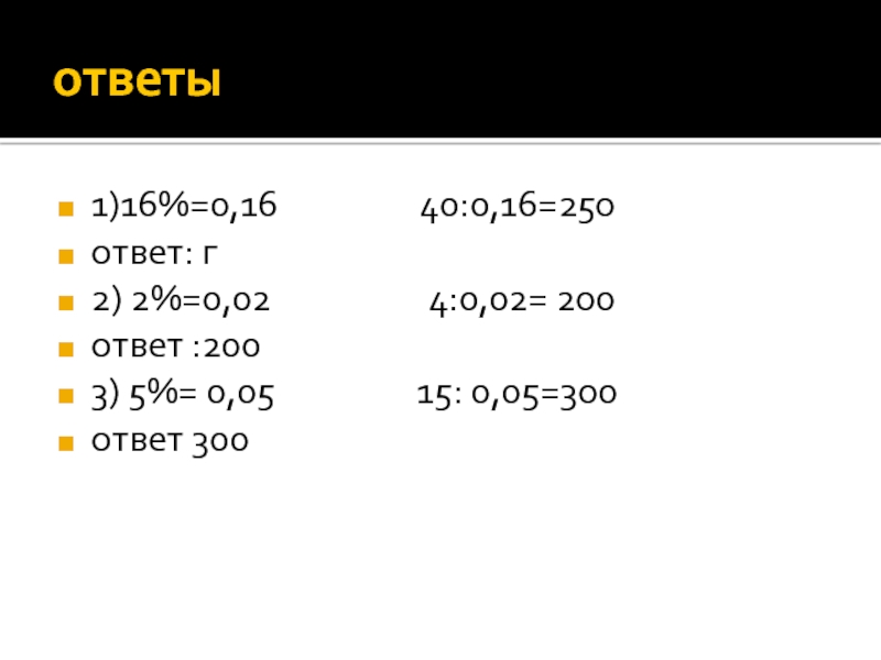 ответы1)16%=0,16         40:0,16=250 ответ: г2) 2%=0,02