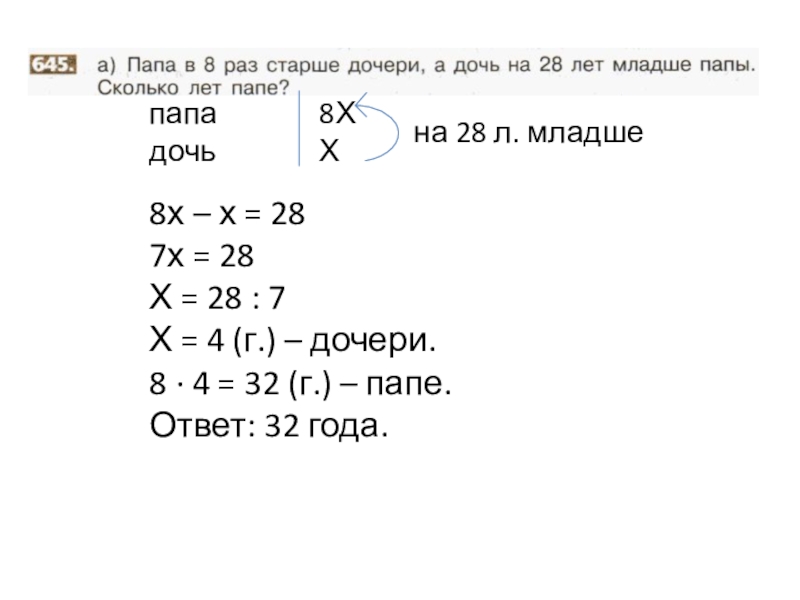 на 28 л. младшепападочь8ХХ8х – х = 287х = 28Х = 28 : 7Х = 4 (г.)