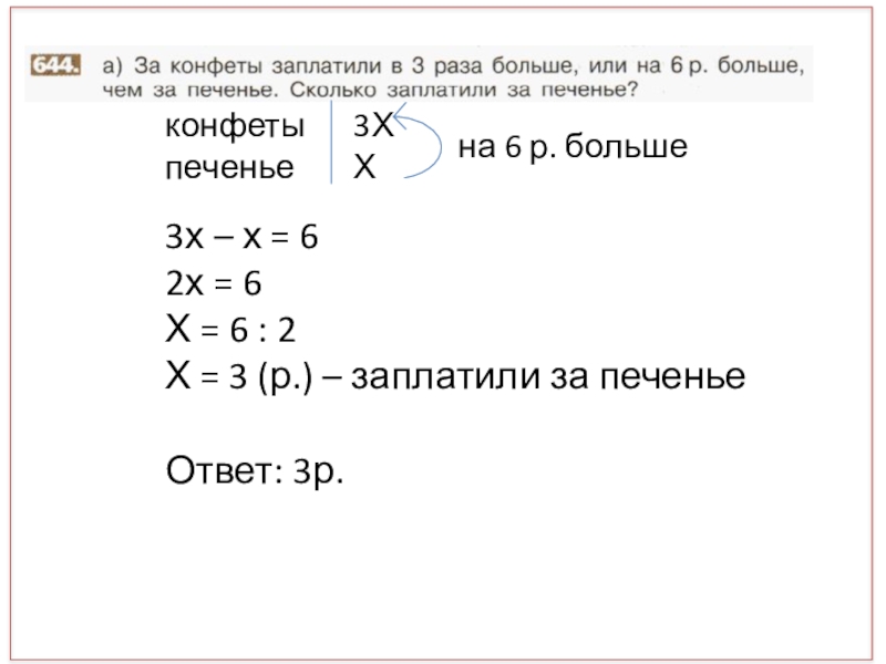 на 6 р. большеконфетыпеченье3ХХ3х – х = 62х = 6Х = 6 : 2Х = 3 (р.)
