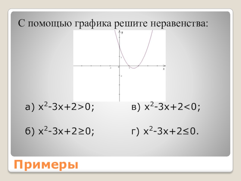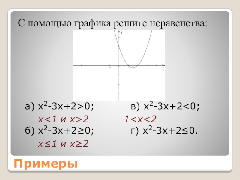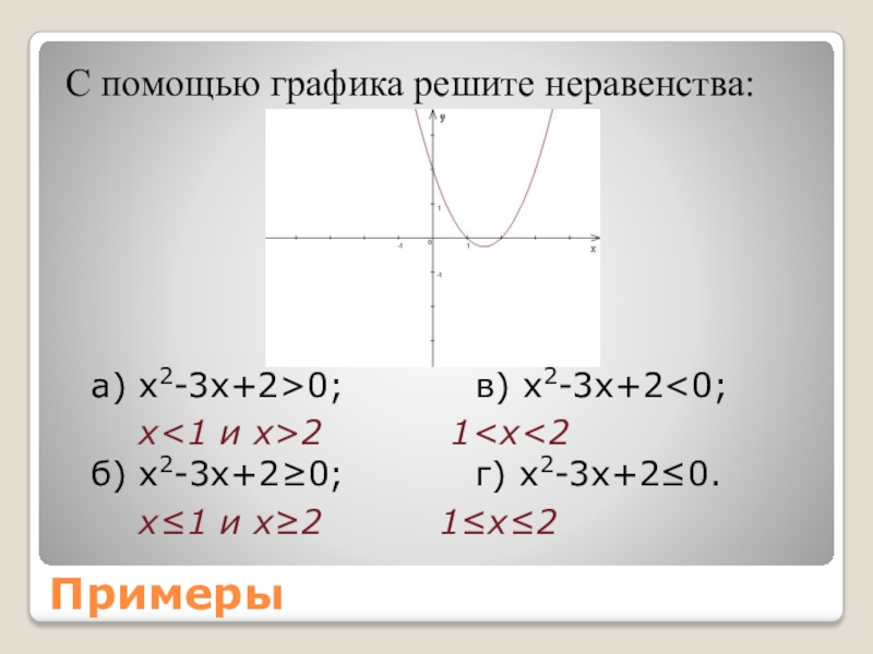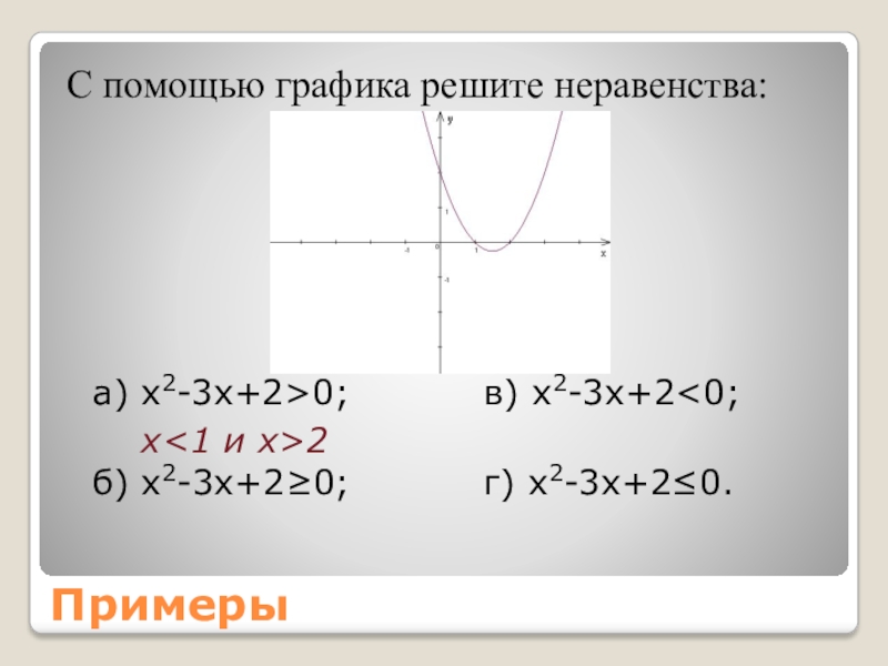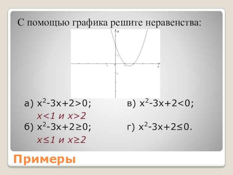 ПримерыС помощью графика решите неравенства:  а) x2-3x+2>0;           в) x2-3x+2