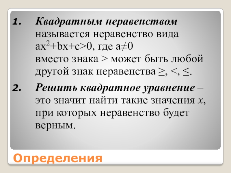 ОпределенияКвадратным неравенством называется неравенство вида ax2+bx+c>0, где а0вместо знака > может быть любой другой знак неравенства ≥,