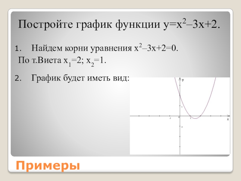ПримерыПостройте график функции y=x2–3x+2.Найдем корни уравнения x2–3x+2=0.По т.Виета x1=2; x2=1.График будет иметь вид: