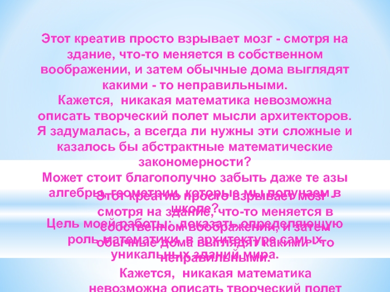 Цель моей работы: доказать определяющую роль математики в архитектуре самых уникальных зданий мира.