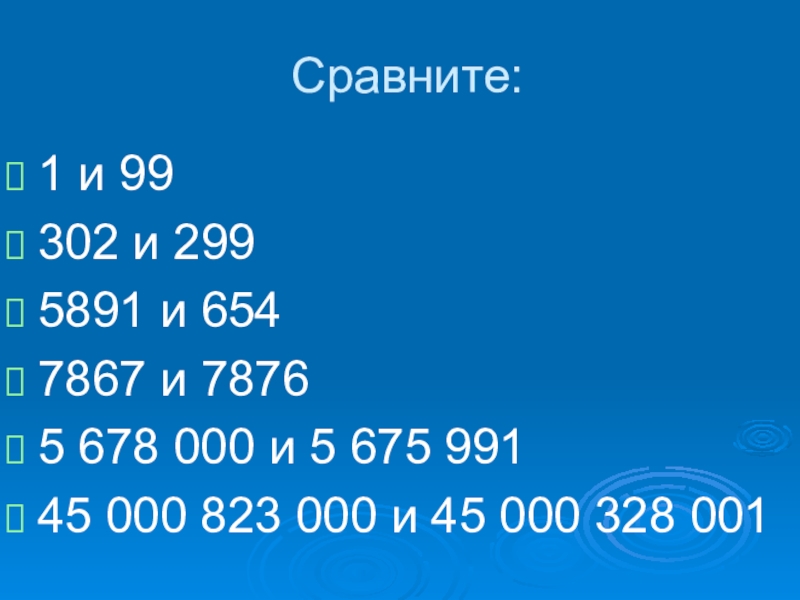 Сравните:1 и 99302 и 2995891 и 6547867 и 78765 678 000 и 5 675 99145 000 823