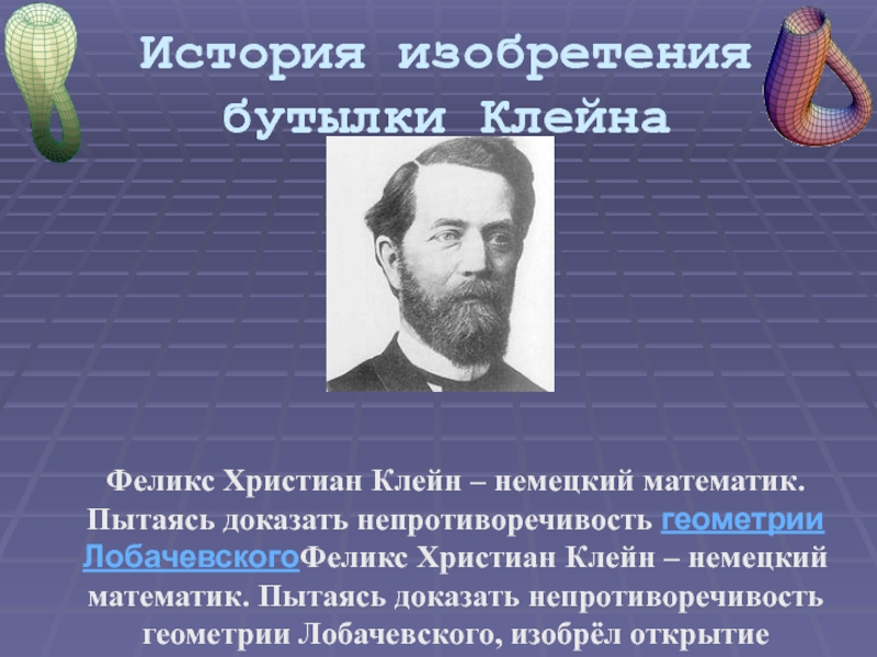 История изобретения бутылки КлейнаФеликс Христиан Клейн – немецкий математик. Пытаясь доказать непротиворечивость геометрии ЛобачевскогоФеликс Христиан Клейн –