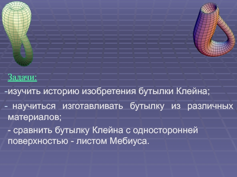 Задачи:изучить историю изобретения бутылки Клейна; научиться изготавливать бутылку из различных материалов;- сравнить бутылку Клейна с односторонней поверхностью