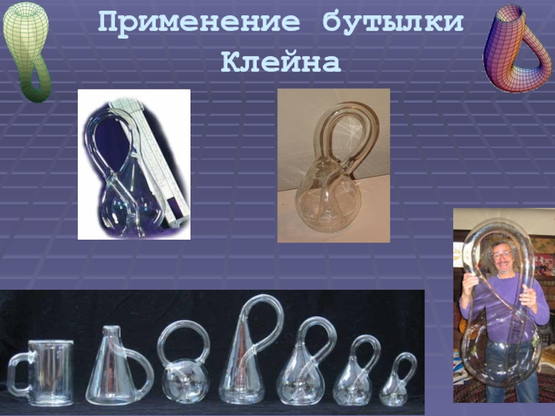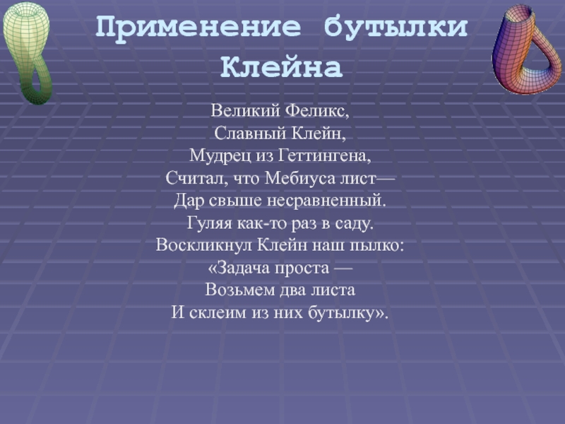 Применение бутылки КлейнаВеликий Феликс, Славный Клейн, Мудрец из Геттингена, Считал, что Мебиуса лист— Дар свыше несравненный. Гуляя