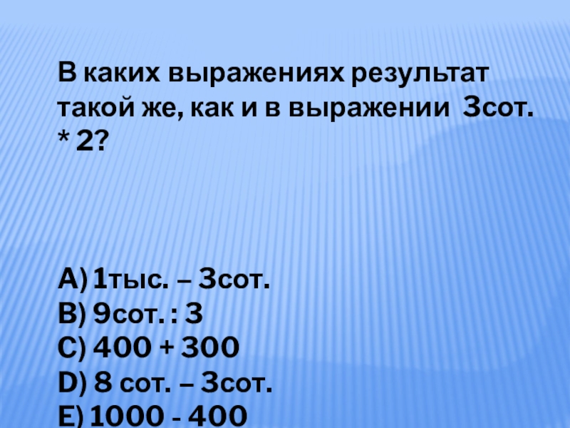 Слайд 2В каких выражениях результат такой же, как и в выражении 3сот.