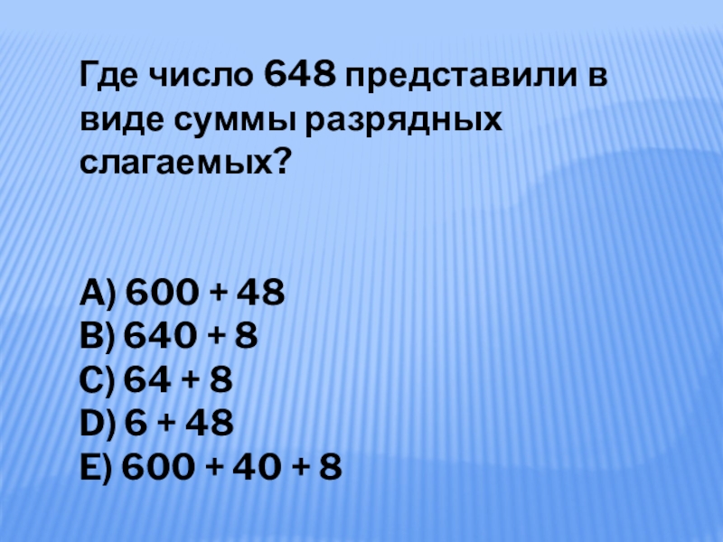 Слайд 11Где число 648 представили в виде суммы разрядных слагаемых?