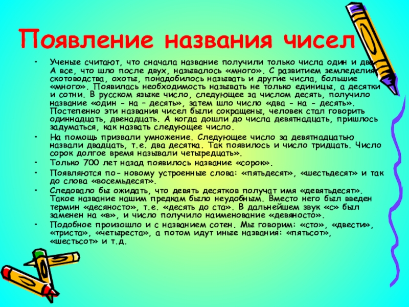 и два. А все, что шло после двух, называлось «много». С развитием земледелия, скотоводства, охоты, понадобилось называть и другие числа, большие «много». Появилась необходимость называть не только единицы, а десятки и сотни. В русском языке число, следующее за числом десять, получило название «один - на – десять», затем шло число «два - на - десять». Постепенно эти названия чисел были сокращены, человек стал говорить одиннадцать, двенадцать. А когда дошли до числа девятнадцать, пришлось задуматься, как назвать следующее число.