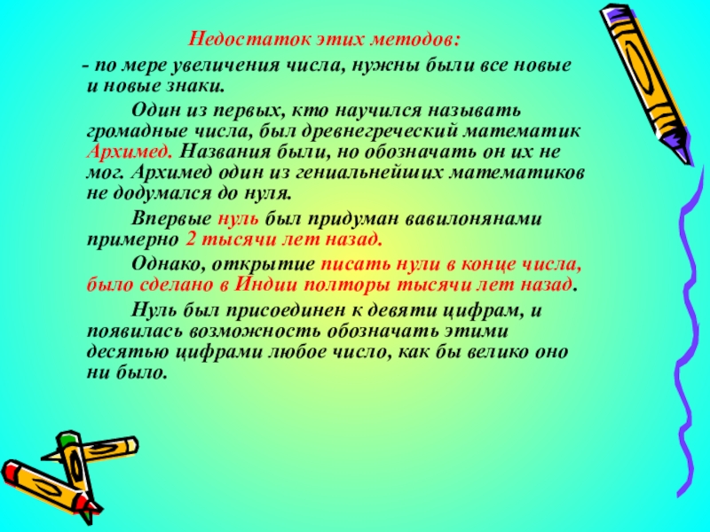 Один из первых, кто научился называть громадные числа, был древнегреческий математик Архимед. Названия были, но обозначать он их не мог. Архимед один из гениальнейших математиков не додумался до нуля.