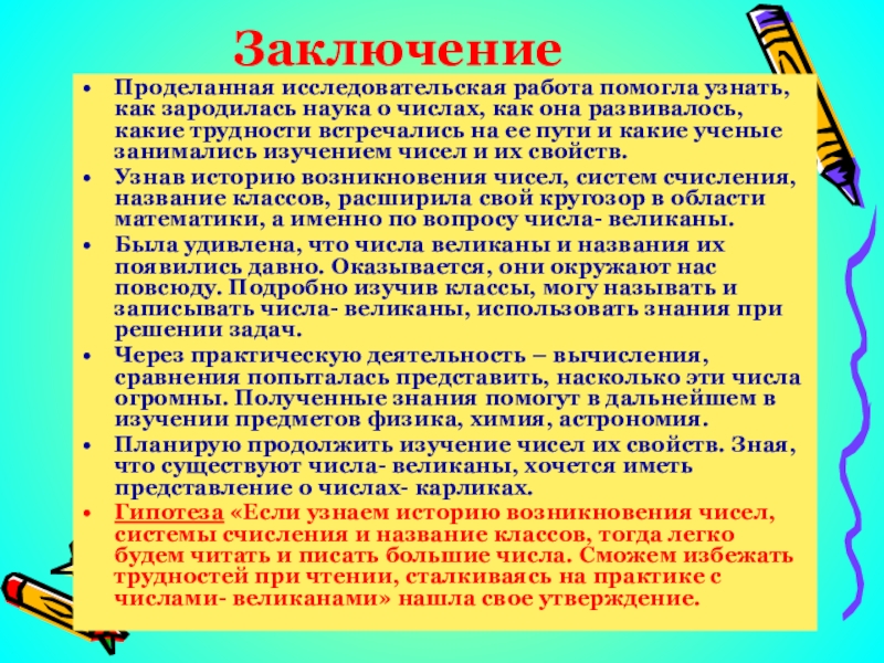Гипотеза «Если узнаем историю возникновения чисел, системы счисления и название классов, тогда легко будем читать и писать большие числа. Сможем избежать трудностей при чтении, сталкиваясь на практике с числами- великанами» нашла свое утверждение.