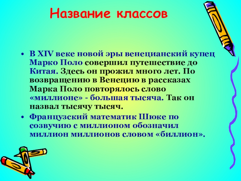 совершил путешествие до Китая. Здесь он прожил много лет. По возвращению в Венецию в рассказах Марка Поло повторялось слово «миллионе» - большая тысяча. Так он назвал тысячу тысяч.