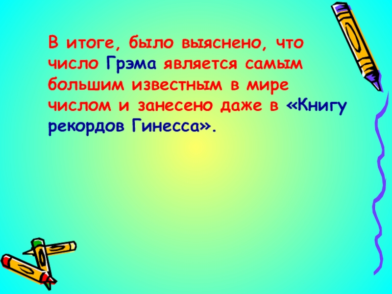 Слайд 18 В итоге, было выяснено, что число Грэма является самым большим