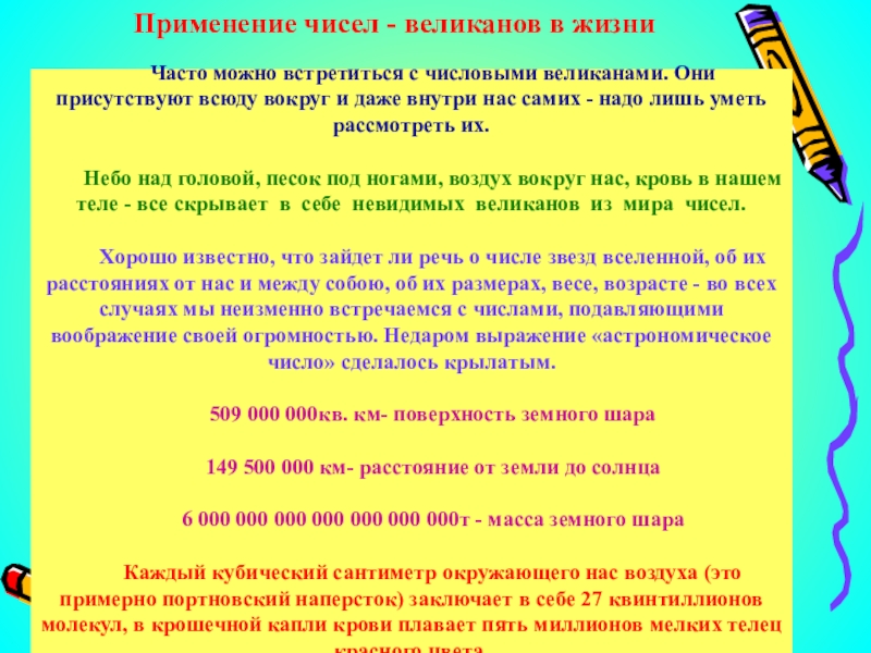 Была удивлена, что числа великаны и названия их появились давно. Оказывается, они окружают нас повсюду. Подробно изучив классы, могу называть и записывать числа- великаны, использовать знания при решении задач.