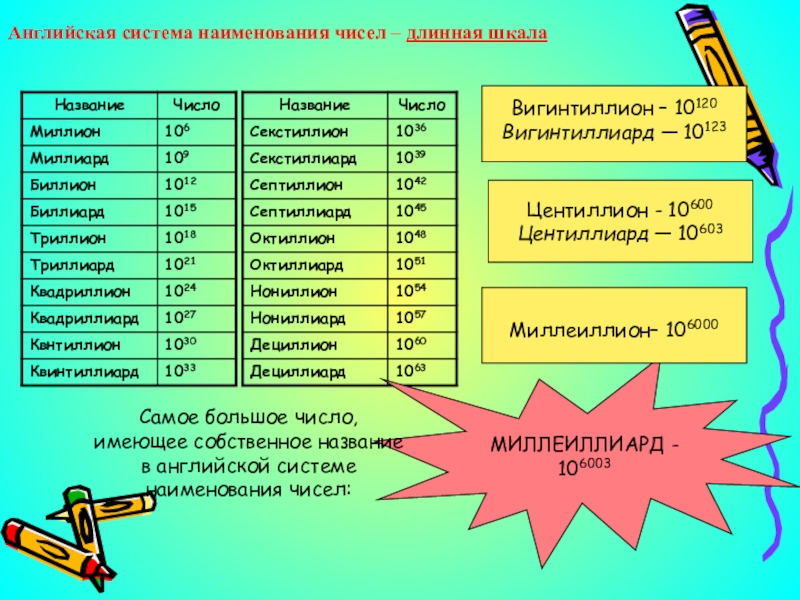 Слайд 14Самое большое число, имеющее собственное название в американской системе наименования чисел: