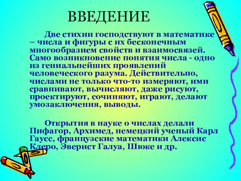 Открытия в науке о числах делали Пифагор, Архимед, немецкий ученый Карл Гаусс, французские математики Алексис Клеро, Эверист Галуа, Шюке и др.
