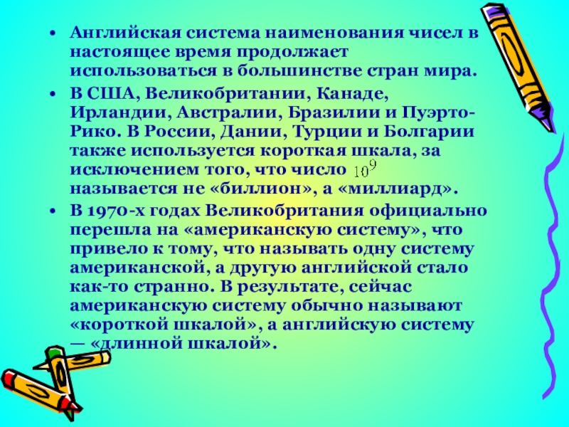 Слайд 16Английская система наименования чисел в настоящее время продолжает использоваться в большинстве