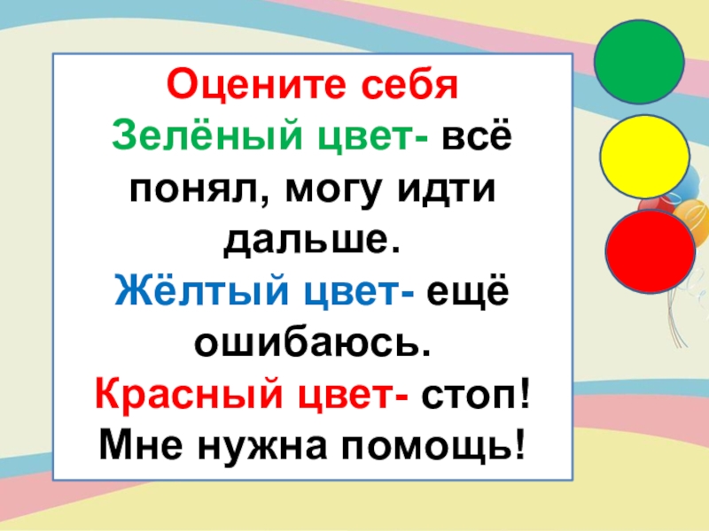 Оцените себяЗелёный цвет- всё понял, могу идти дальше.Жёлтый цвет- ещё ошибаюсь.Красный цвет- стоп! Мне нужна помощь!