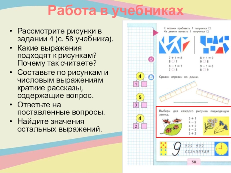 Работа в учебникахРассмотрите рисунки в задании 4 (с. 58 учебника).Какие выражения подходят к рисункам? Почему так считаете?Составьте