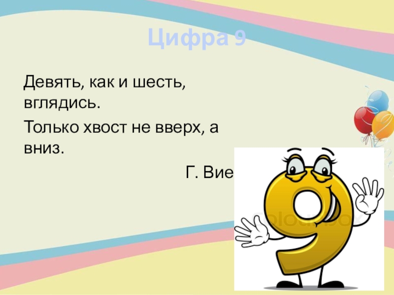 Цифра 9Девять, как и шесть, вглядись.Только хвост не вверх, а вниз.Г. Виеру