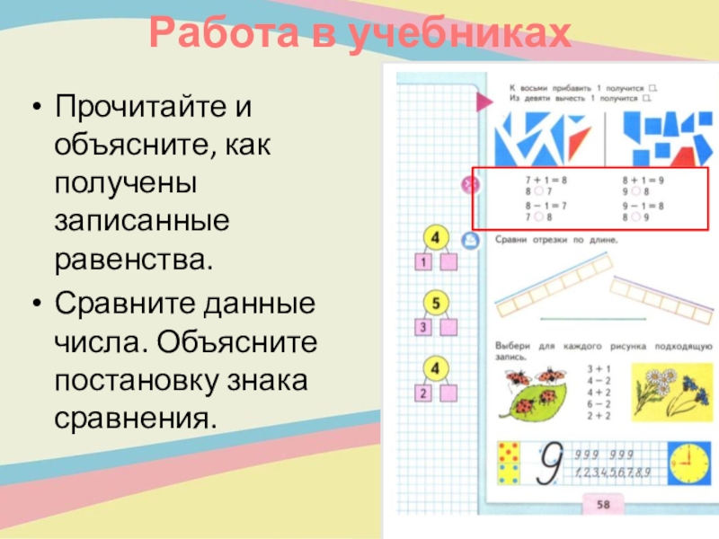 Работа в учебникахПрочитайте и объясните, как получены записанные равенства.Сравните данные числа. Объясните постановку знака сравнения.