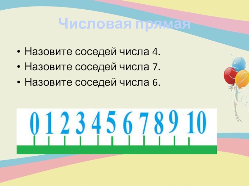 Числовая прямаяНазовите соседей числа 4.Назовите соседей числа 7.Назовите соседей числа 6.