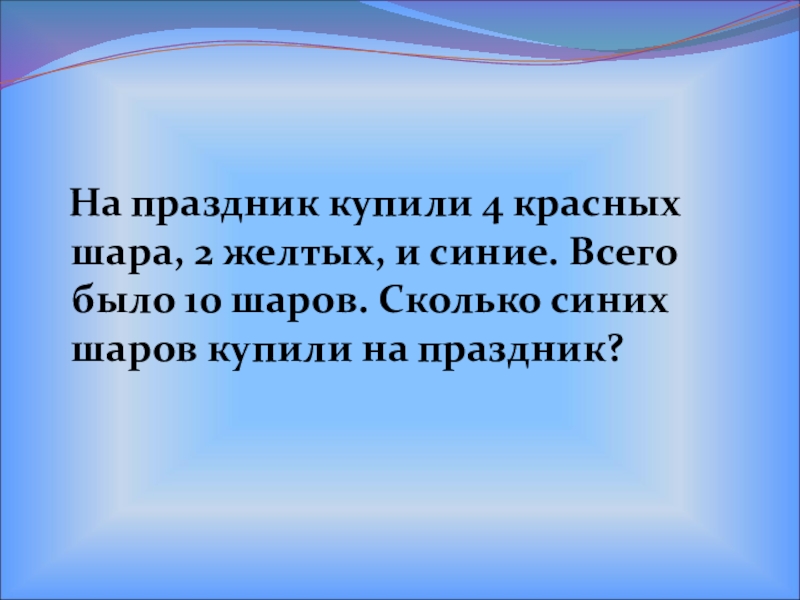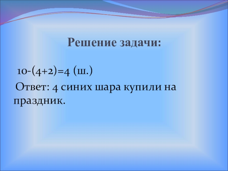 Решение задачи:  10-(4+2)=4 (ш.)  Ответ: 4 синих шара купили на     праздник.
