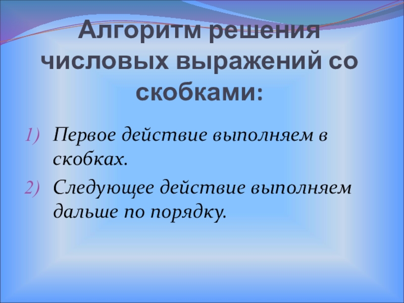 Алгоритм решения числовых выражений со скобками:Первое действие выполняем в скобках.Следующее действие выполняем дальше по порядку.