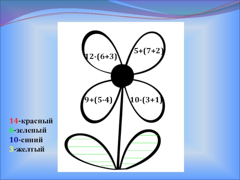 5+(7+2)10-(3+1)9+(5-4)12-(6+3)14-красный6-зеленый10-синий3-желтый