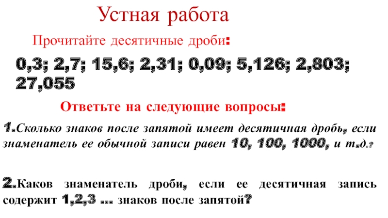 1.Сколько знаков после запятой имеет десятичная дробь, если знаменатель ее обычной записи равен 10, 100, 1000, и т.д.?