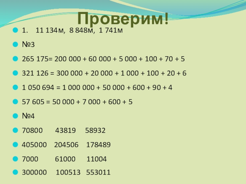 Проверим!1.  11 134м, 8 848м, 1 741м№3265 175= 200 000 + 60 000 + 5 000 + 100 +