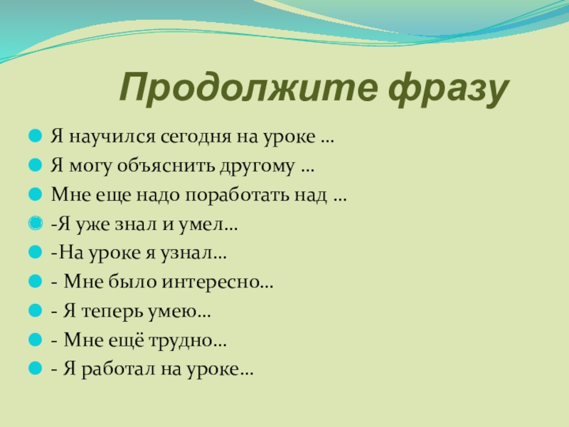 Продолжите фразуЯ научился сегодня на уроке …Я могу объяснить другому …Мне еще надо поработать над …-Я уже