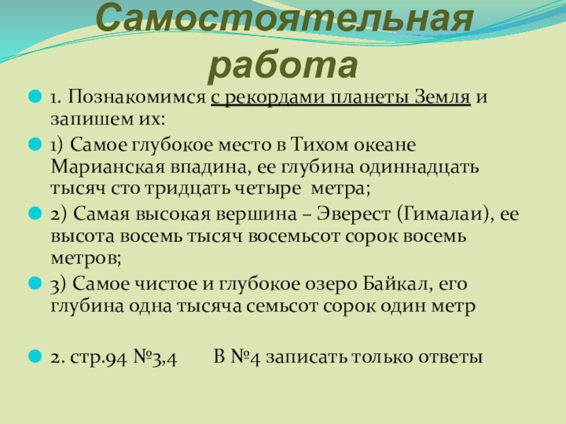 Самостоятельная работа1. Познакомимся с рекордами планеты Земля и запишем их:1) Самое глубокое место в Тихом океане Марианская впадина, ее