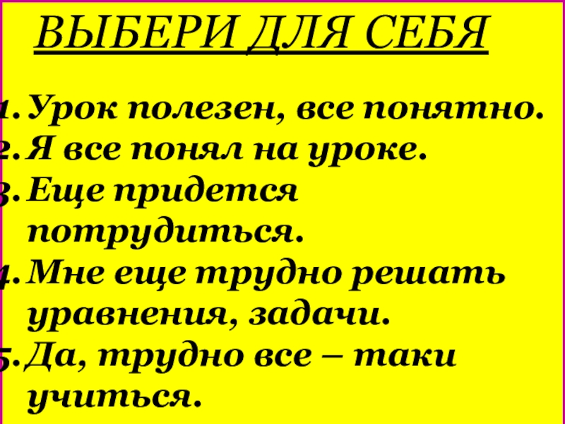ВЫБЕРИ ДЛЯ СЕБЯУрок полезен, все понятно.Я все понял на уроке.Еще придется потрудиться.Мне еще трудно решать уравнения, задачи.Да,