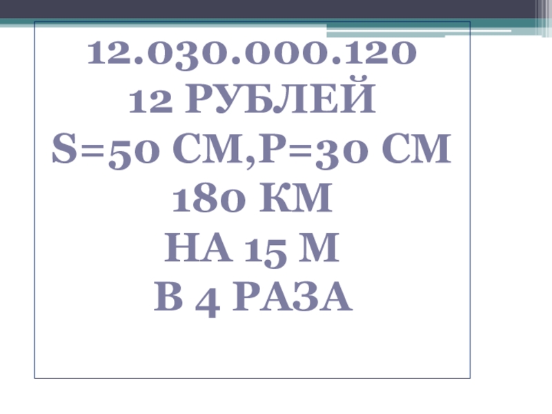 12.030.000.12012 рублейS=50 см,P=30 см180 кмНа 15 мВ 4 раза