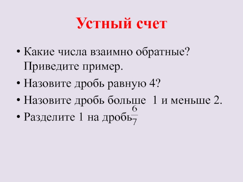 Устный счетКакие числа взаимно обратные? Приведите пример.Назовите дробь равную 4?Назовите дробь больше 1 и меньше 2.Разделите 1