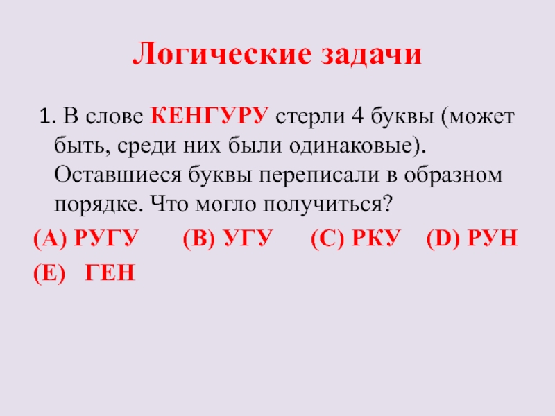 Логические задачи 1. В слове КЕНГУРУ стерли 4 буквы (может быть, среди них были одинаковые). Оставшиеся буквы