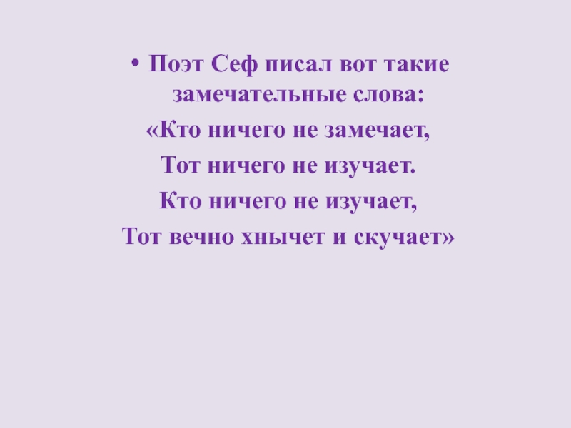 Поэт Сеф писал вот такие замечательные слова: «Кто ничего не замечает,Тот ничего не изучает.Кто ничего не изучает,Тот вечно хнычет и скучает»